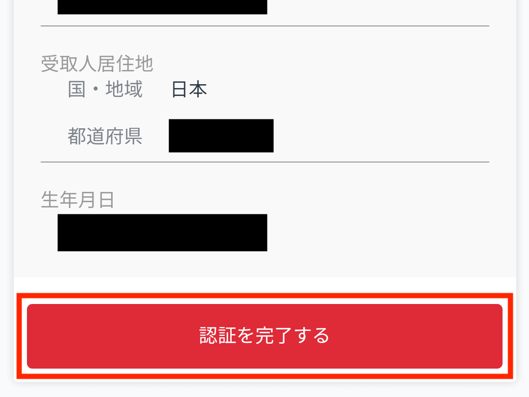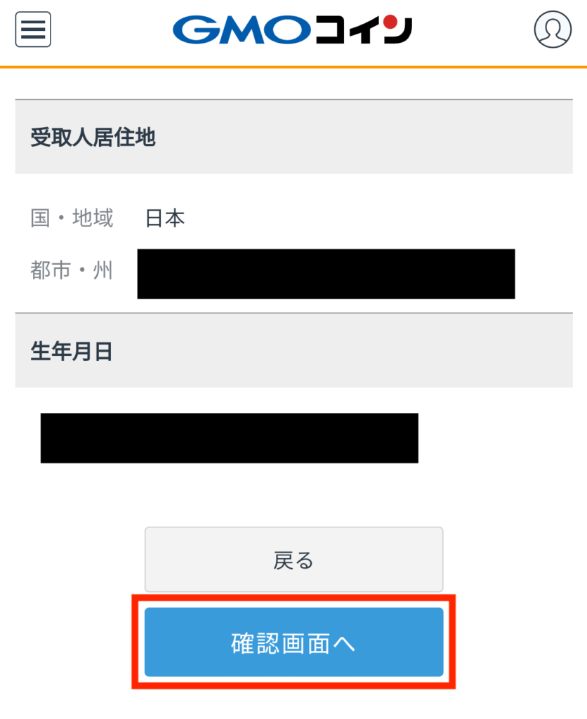 入力内容の氏名、受取人住所地、生年月日などはGMOコインに登録したものが自動で表示されます。