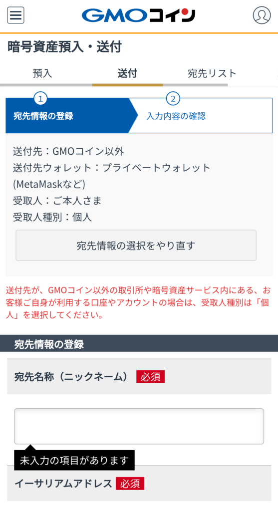 「GMOコイン」宛先名称、イーサリアムアドレス等の入力