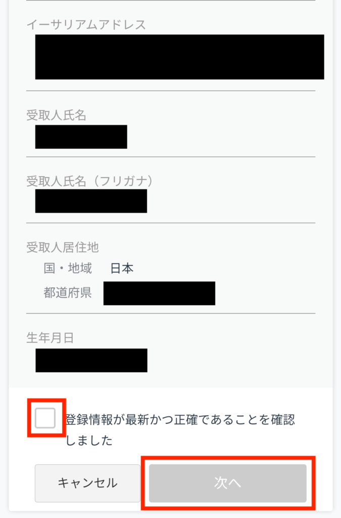 宛先情報に間違えがなければチェックボックスにチェックを入れて「次に」をタップします。