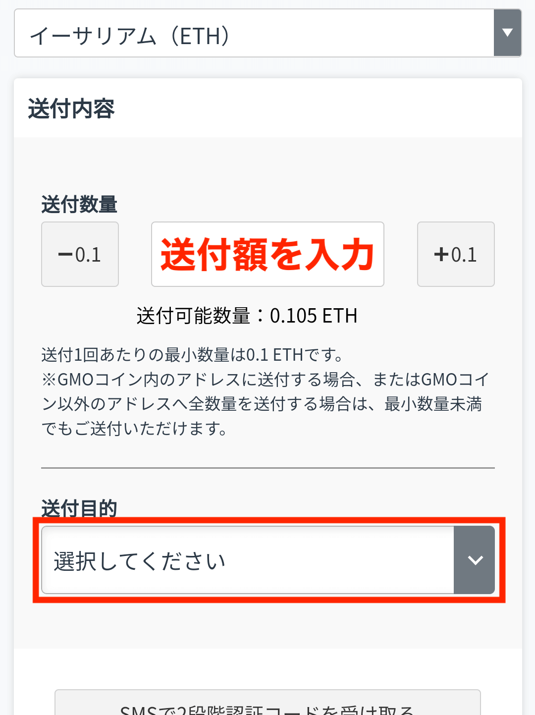 • GMOコインの最低送金額は0.1ETH(0.1ETH以下は、全額送金のみ対応)