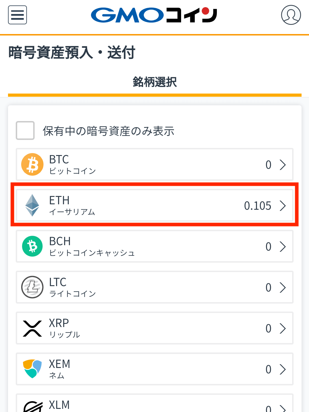 送金の際はGMOコイン内にETH(イーサリアム)を購入し、保有している必要があります。
