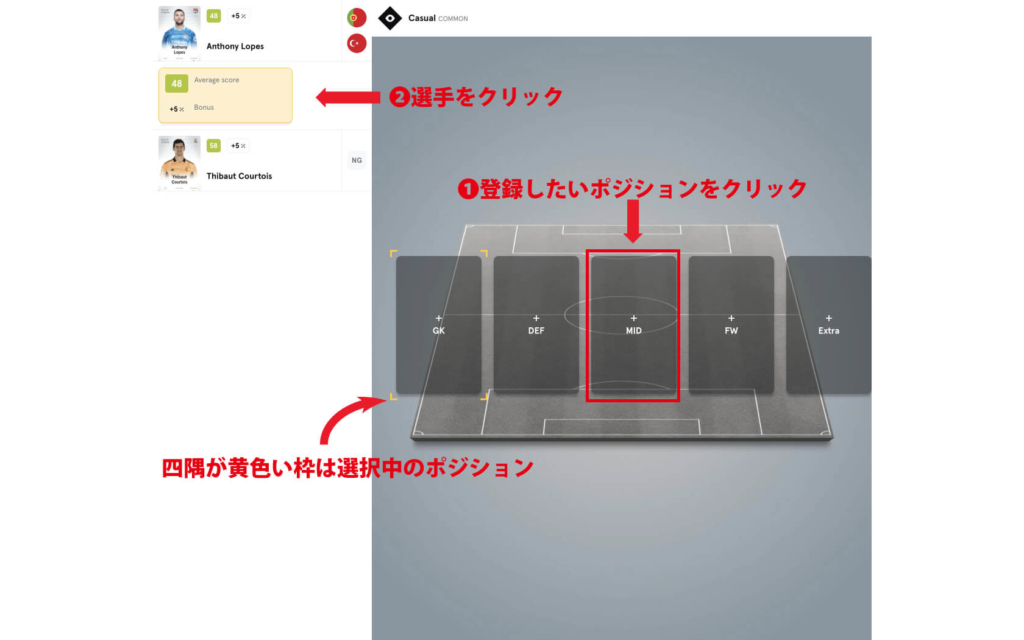実際のサッカーは11人でスカッドを組みますが、sorare(ソラーレ)では指定されたポジションの5人でスカッドを組みます。
