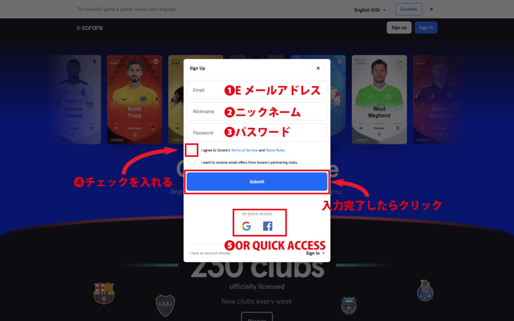 - 「i agree to sorare’s terms of service and game rules」にチェックを入れる