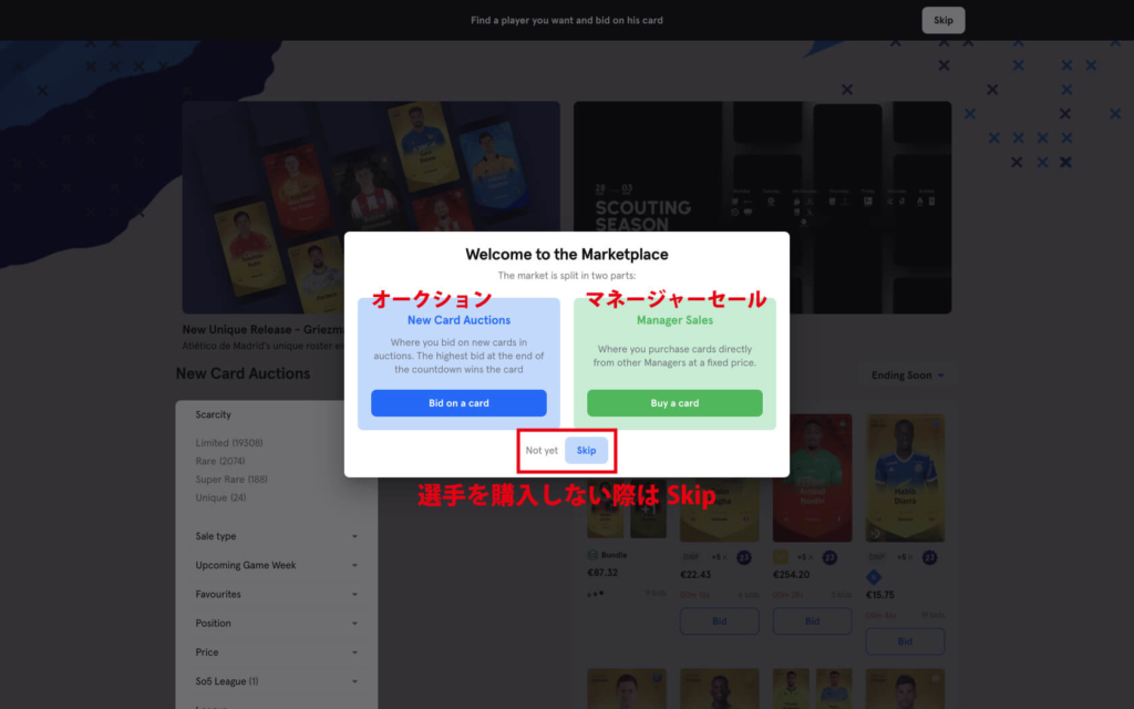 カードを購入する際は「New Card Auctions」か「Manager Sales」のどちらかを選択します。