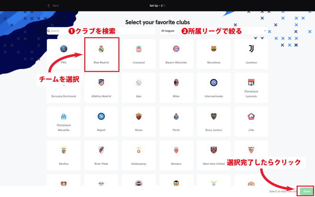 - 右上「All leagues」で各国のリーグ単位での表示ができます。