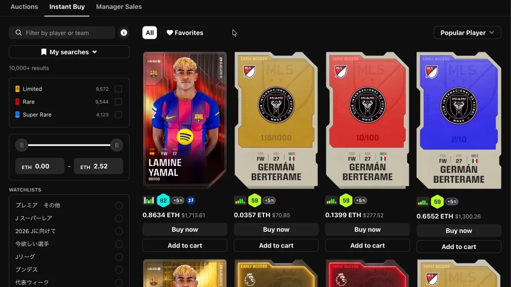 オークションの終了時間を待たず、提示された定価ですぐにSorare カードを手に入れることができます。