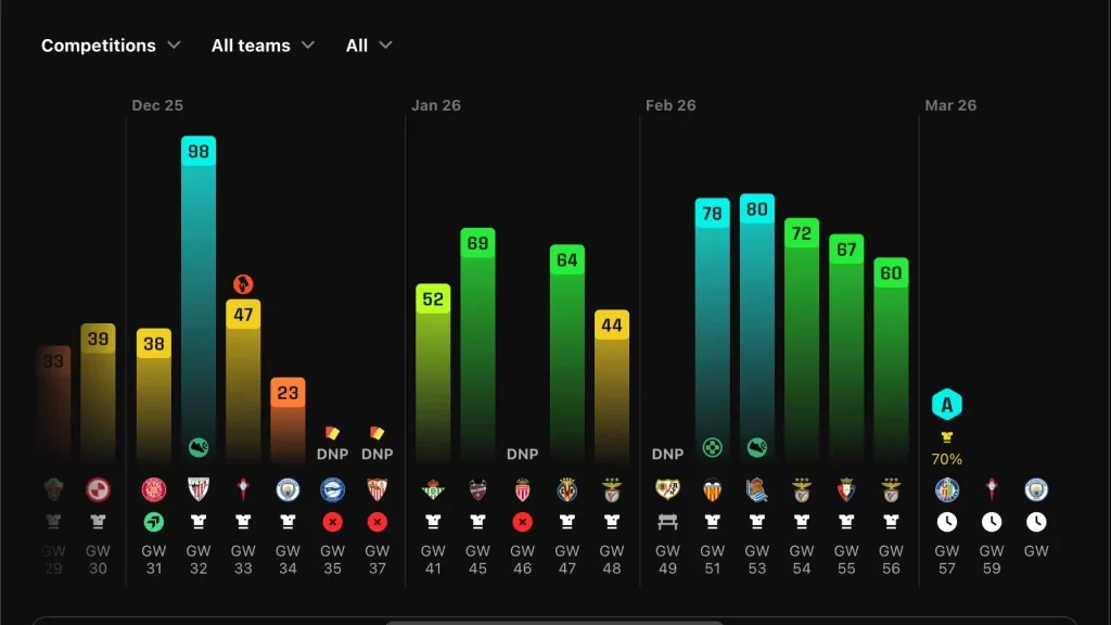グラフが安定して緑色(60点以上)を維持できているかどうかが、スタメンとしての信頼度を測る指標になります。