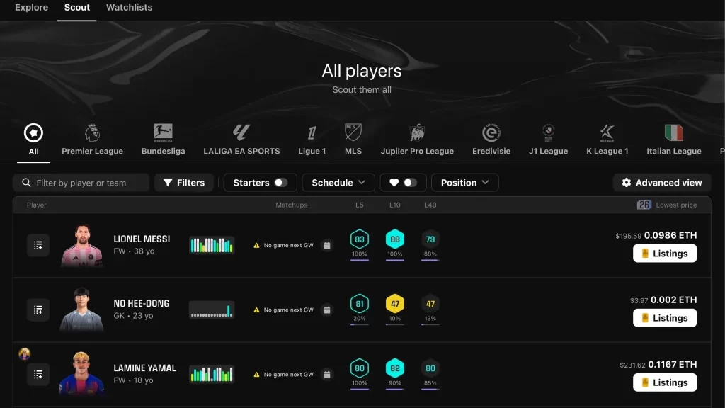「スカウト」はSorare内の各リーグ(トーナメント)ごとに選手がリストアップされている画面です。