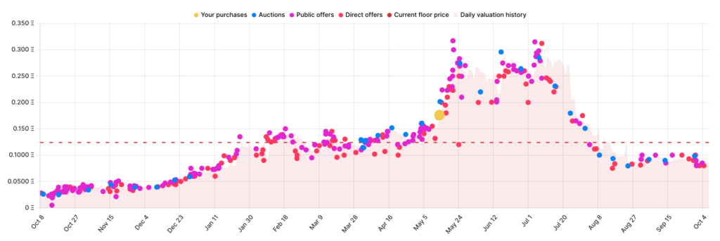 スコアが好調だった事もあり、2022/5/13のあたりから菅選手のカード価格は約2倍以上にもなる0.27ETHまで高騰しているのがわかるかと思います。