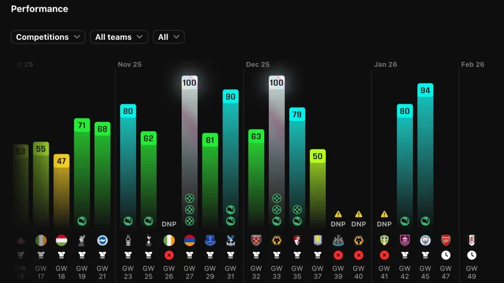 - CS(クリーンシート)の予測がムズい: 1強(または2強)が固定されている他リーグと違い、プレミアは中下位クラブの攻撃力も非常に高く、強豪クラブであっても完封が難しいリーグです。HOT STREAKSの安定に欠かせない「GKのCSボーナス」が計算しづらい点はリスクと言えます。