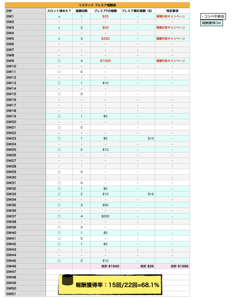 | 報酬獲得回数 | 15回 / 22GW | 11回 / 38GW |