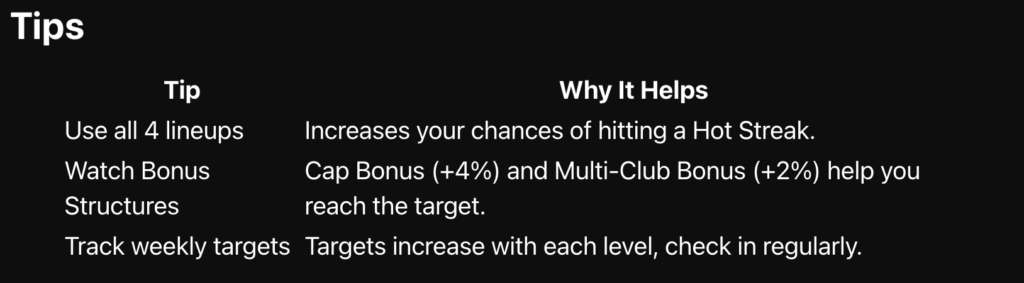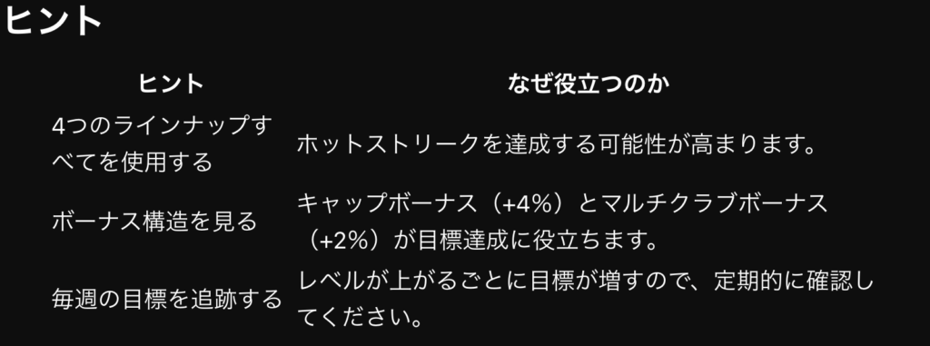 - 1〜3連勝目: AA(オールアラウンド)スコアが安定して出るDFにキャプテンを任せ、ボーナスを確実に「外さない」ことで次へ繋ぎます。