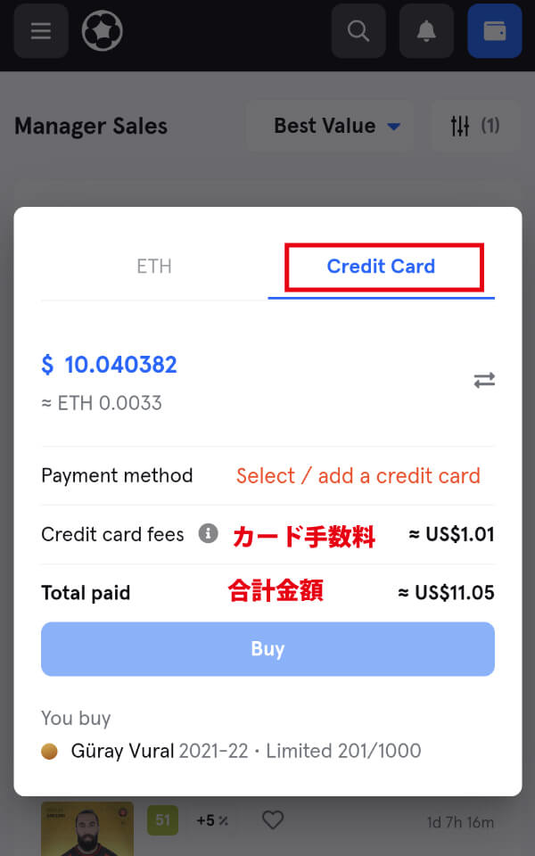 Sorareのヘルプにも書かれていますが、マネージャーセールでクレジット決済すると決済額の10%が手数料として発生します。