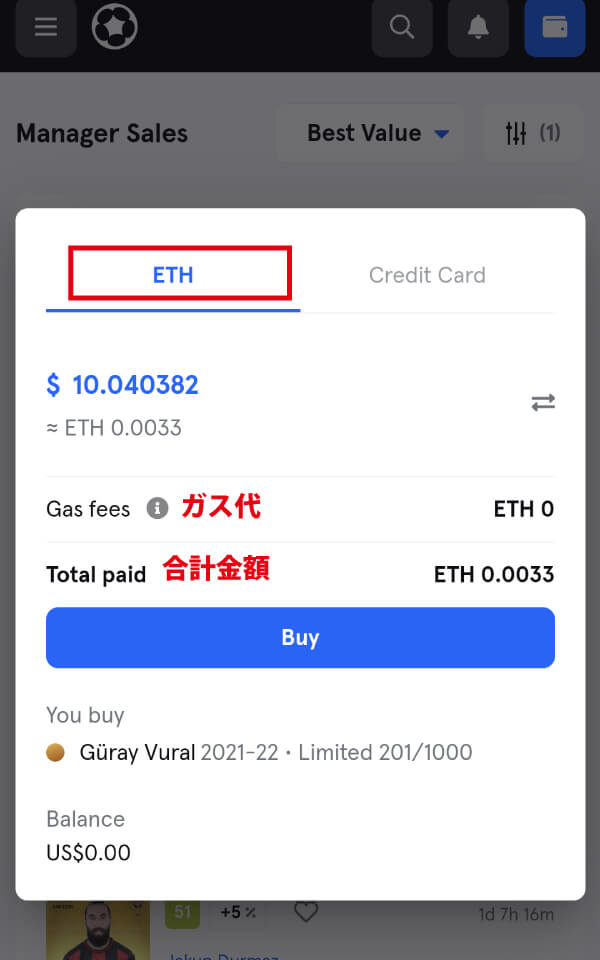 「Manager Sale」画面にて、欲しい選手カードの[Buy]をタップします。