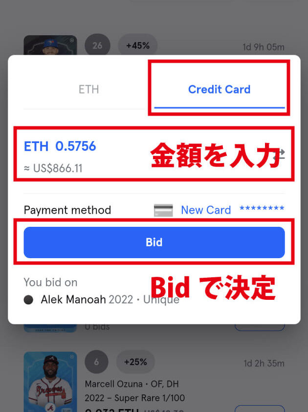 オークションの入札は、ETHとクレジットカードで支払う事が可能です。