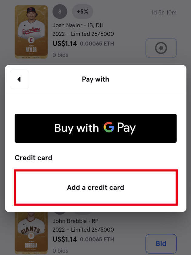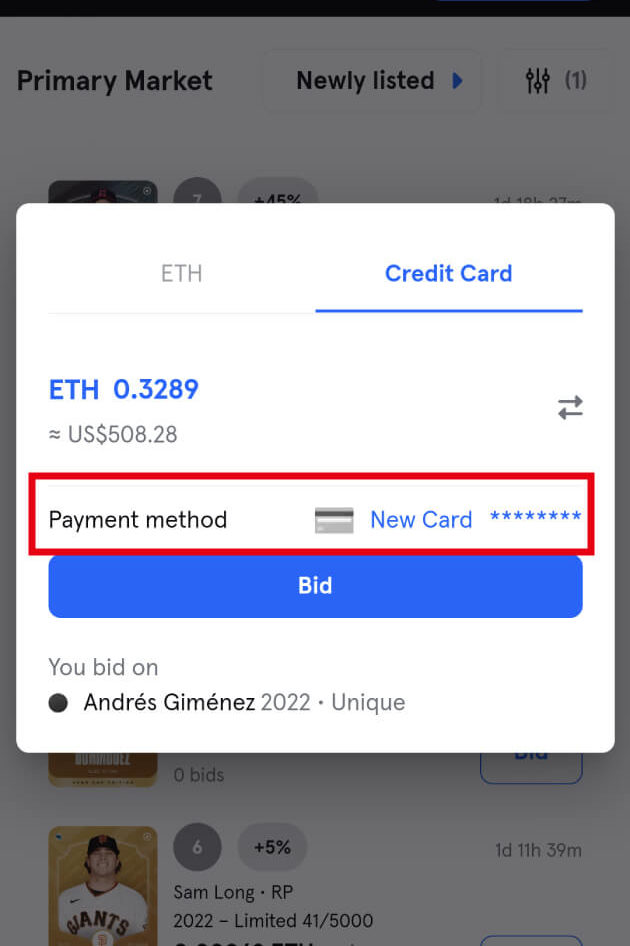 「New Card Auction」にはETH(仮想通貨)とクレジットカードの2つの支払い方法があります。