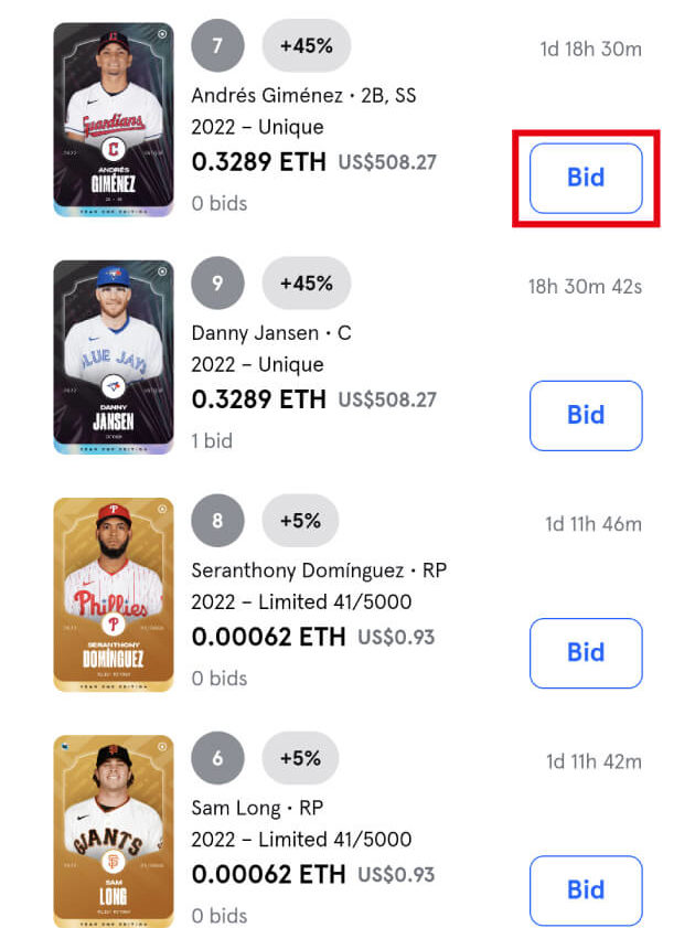 「New Card Auction」画面にて、欲しい選手カードの[Bid]をタップします。