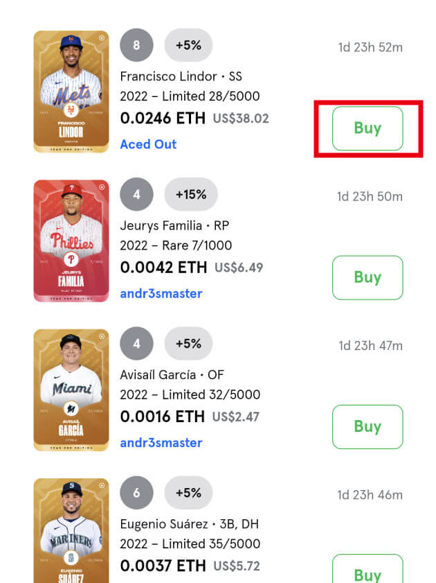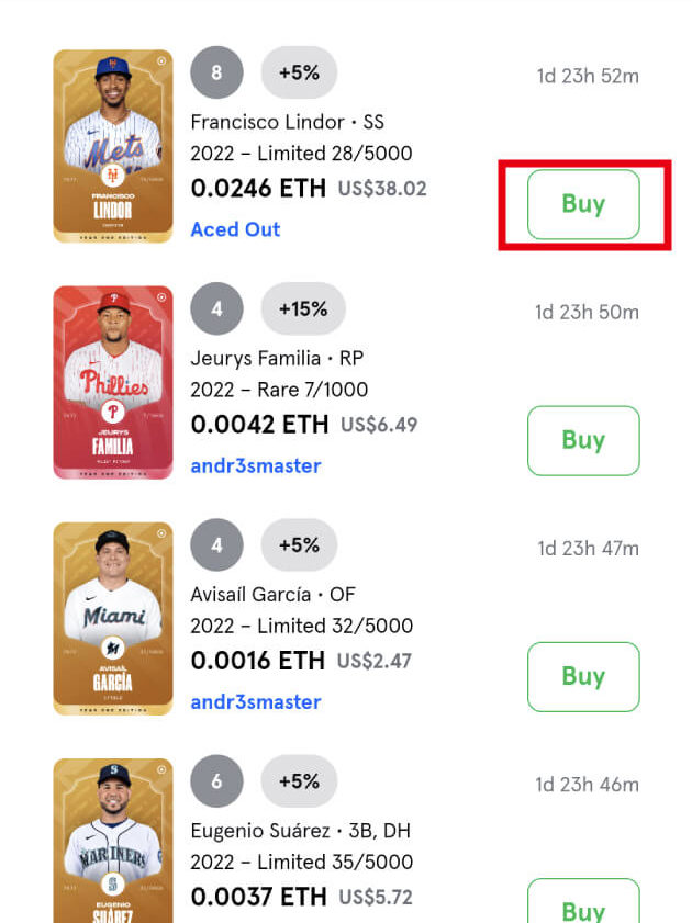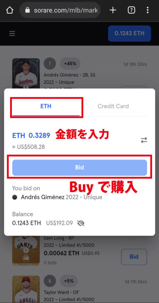 Sorare MLB内での選手カードの購入方法は以下の2つがあります。