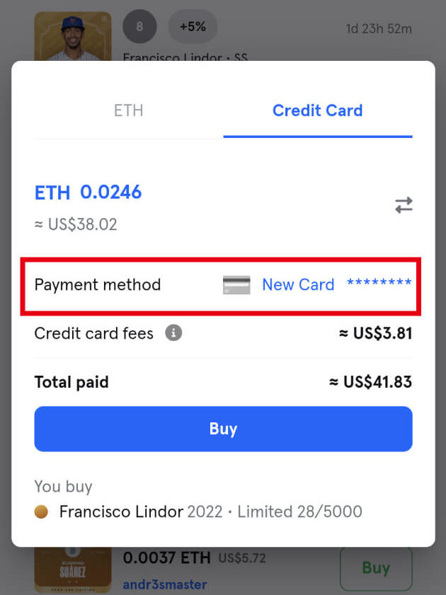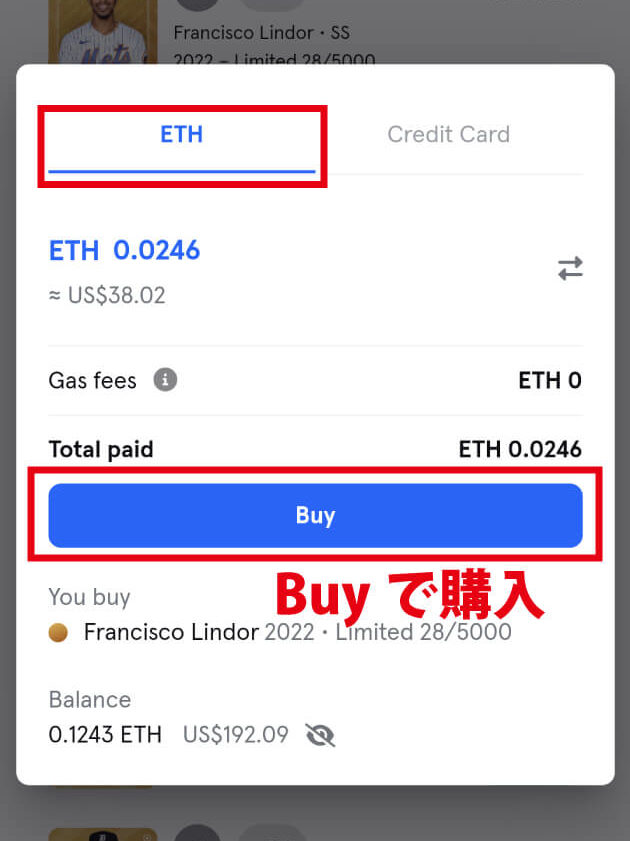 同じ選手カードをETH決済の際と、クレジット決済の際の比較をしてみます。