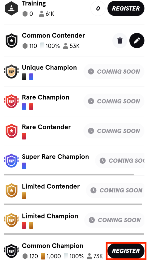 画面を下にスクロールすると各種トーナメントが表示されますので「Common Champion」の「REGISTER」をタップします。