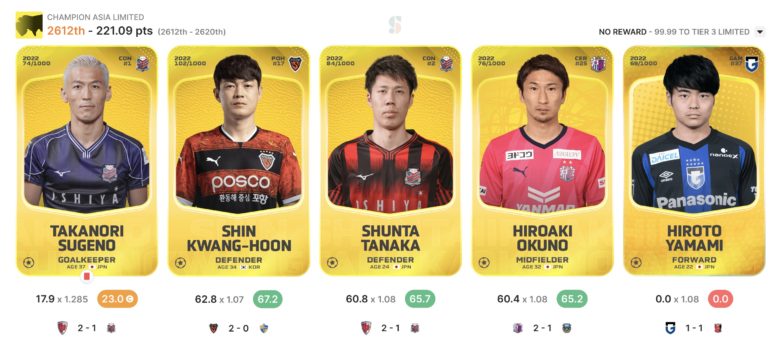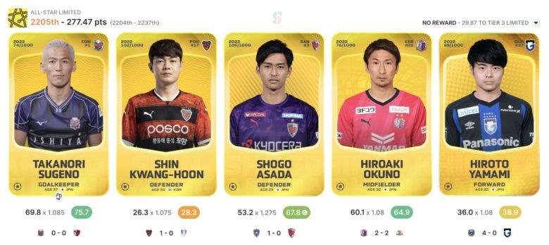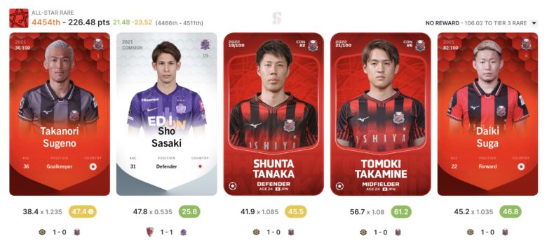 一方、私のSorareは、菅選手が100ptsを獲得の大車輪の活躍を見せ、コモンのためポイントが-46%になるにも関わらず、谷口選手が47ptsとすさまじい活躍により205pts以上を達成し、All Star Rareのスコア報酬をゲットできました。
