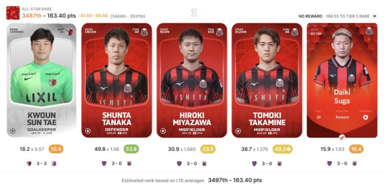 Jリーグの序盤はカードがなかなか揃えられなかったり、選手が怪我をしてしまったりでAll Star Rareのスコア報酬は獲得出来ていませんでしたが、ここにきて順調に獲得できています。